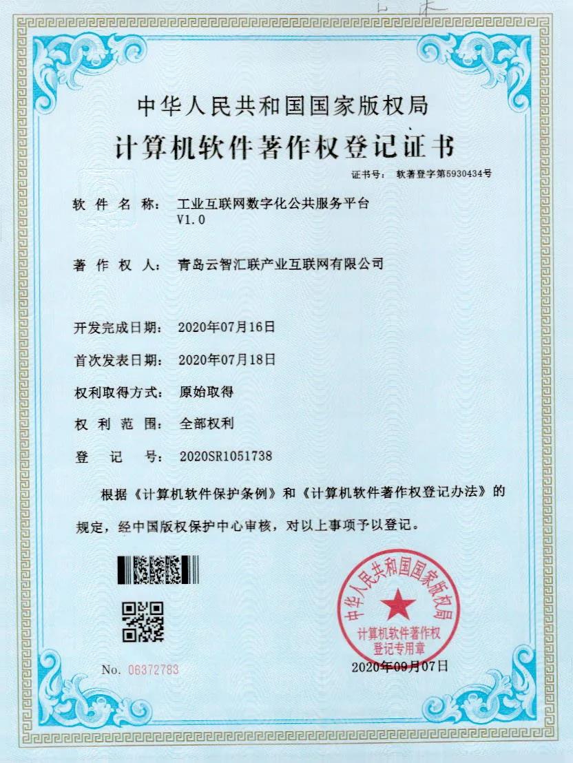 近日,青島云智匯聯產業互聯網有限公司在綠天使指導咨詢下順利通過了軟件產品——“工業互聯網數字化公共服務平臺V1.0”,獲得國家版權局計算機軟件著作權登記證書。